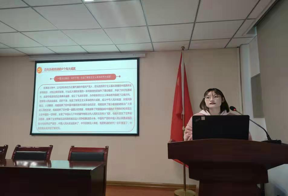 毛俞玮同学以《“数览”十九届六中全会》为题,分别从中国共产党百年历程创造的“四个伟大成就”、中国共产党百年奋斗的“五大历史意义”及中国共产党百年奋斗总结的“十个坚持”历史经验等内容出发,引导大家深入了解学习贯彻十九届六中全会精神的重要内容和重要意义以及《党的百年奋斗重大成就及历史经验》决议的重要地位。