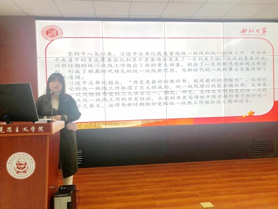 师妍同学以《延安时期党的统一战线理论与实践研究及其现实启示》为主题,向同学们详细介绍了延安时期党的统一战线工作的历史背景、历史实践、理论内涵以及现实启示,进一步深化了同学们对延安时期党的统一战线工作的认识和理解。