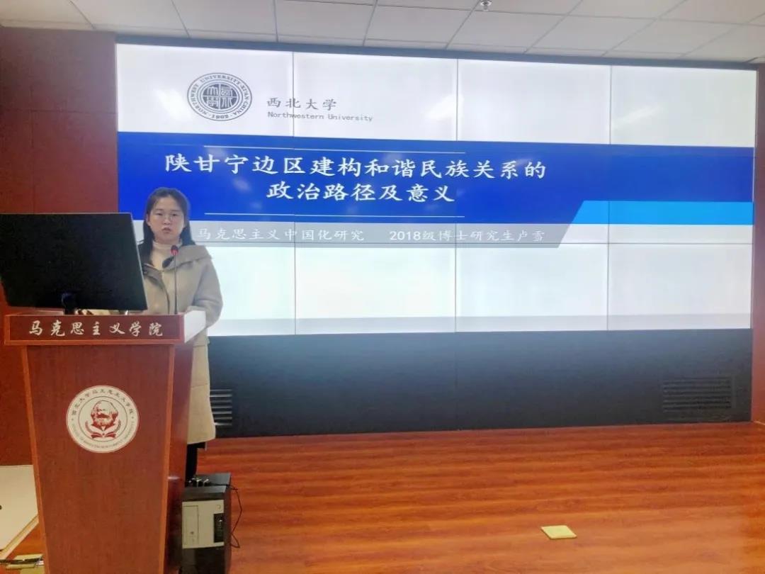 卢雪同学以《陕甘宁边区建构和谐民族关系的政治路径及意义》为主题,以其独特见解从支持少数民族参政议政、保证少数民族群众参与和组织各种群众性团体的权利、赋予少数民族区域自治权三个维度进行了深入讲解,为同学们提供了学术研究的新思路、新角度和新启发。