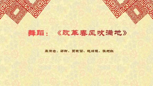 改革春风吹满地,新的一年要争气,线上跨年真高兴,全场掌声响不停。郭甜、贾晓雪、赵炫植、张旭红同学为我们带来健美操表演《改革春风吹满地》,她们跳出了热情似火的青春朝气,也舞出了奋发向上的精神风貌。
