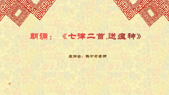 1958年7月1日,毛泽东同志读《人民日报》时,得知余江县消灭了血吸虫,浮想联翩,夜不能寐,欣然命笔,创作了七律二首《送瘟神》。陈中奇老师以其铿锵有力、情感丰沛的诵读向我们传递着坚韧不拔、攻坚克难的勇气和力量,激励着我们齐心协力共同抗疫、砥砺前行共盼春来。
