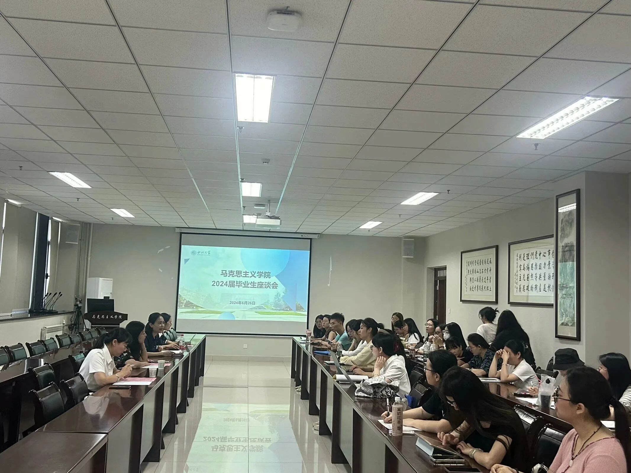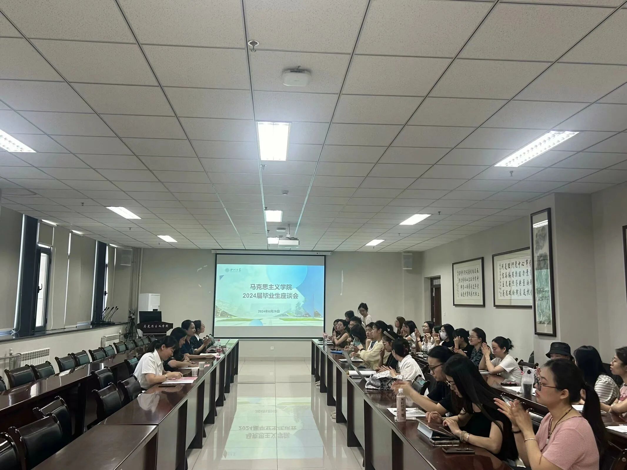 6月26日上午,永利官网于学院会议室举办2024届毕业生座谈会及离校教育。院党委副书记邵平,2021级马原专业班主任郭莹老师,2021级马中化、近代史专业班主任何金凤老师,辅导员刘娟,2024届全体毕业生参加座谈会。会议由永利官网党委副书记邵平主持。